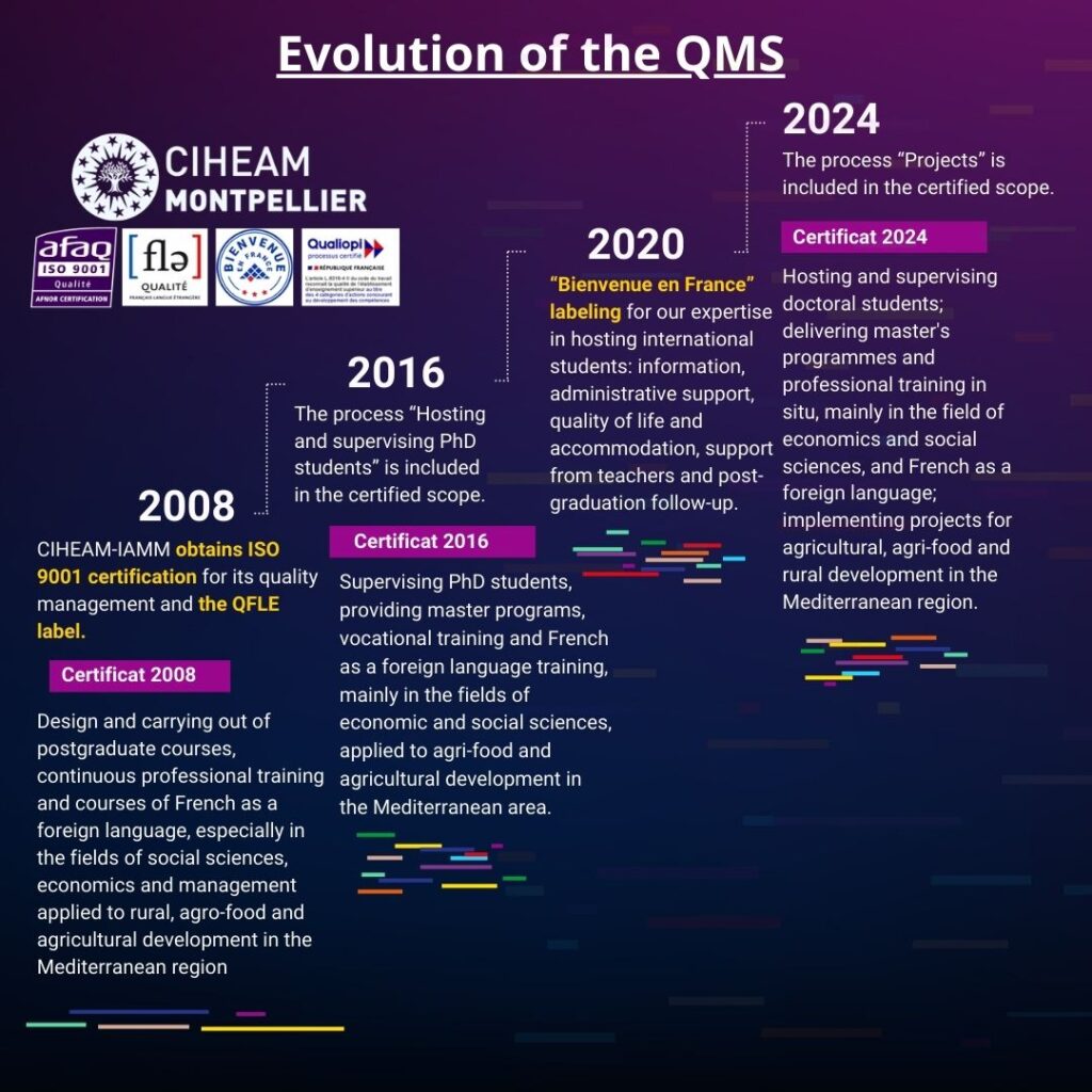 Since 2008, CIHEAM Montpellier has validated its continuous improvement process by obtaining ISO 9001 certification for its management of on-site training. Following the integration of the Project process, from 2024 onwards, the CIHEAM-IAMM management system is certified for the following activities: