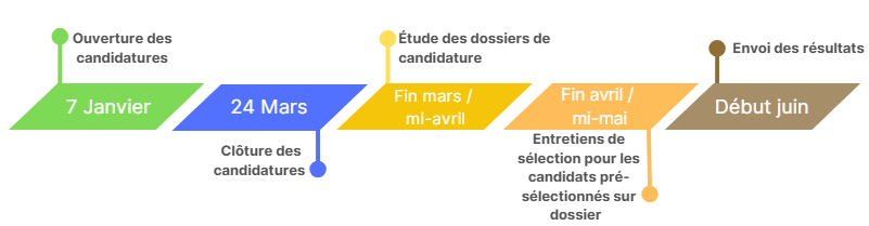 Attention, les demandes de bourse d’études sont très souvent à déposer plusieurs mois à l’avance. Nous vous conseillons de soumettre votre candidature en ligne le plus tôt possible.